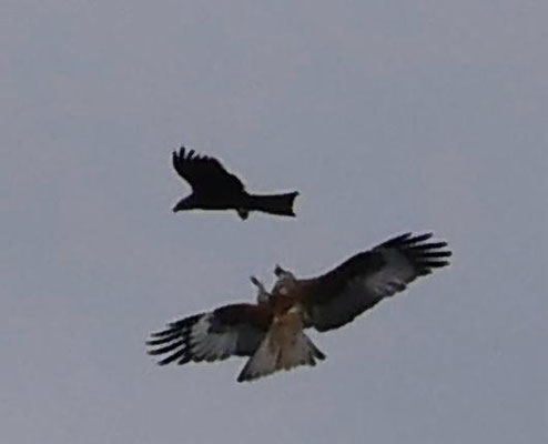 Schwarzmilan, Fuchs, Ringdrossel, Rotmilan mit Krähe, Löffelentenpaar. (Fotos: Harald Auth)